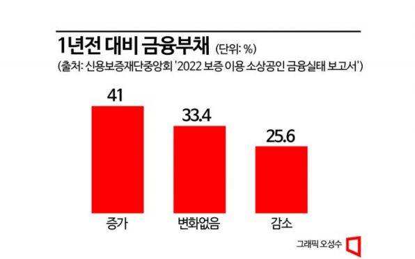 소상공인 10명 중 4명은 시간이 갈수록 빚이 늘어난다고 했다. 1년 전 대비 부채가 증가한 사업장이 41.0%에 달했다. 1년 전과 동일하다는 33.4%였고, 감소했다(2.56%)는 제일 적었다.