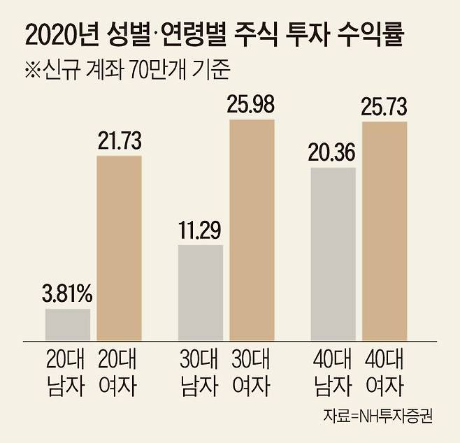 거래를 많이 할수록 수수료가 많이 부과돼 그만큼 수익률도 떨어진다. 남성은 이 수수료로 이익이 2.65% 감소하고, 여성은 1.72% 감소했다. 원래 수익은 동일했지만, 남성은 수수료로 지출하는 게 여성보다 1% 더 많았다. 결국 최종적인 수익률도 여성이 남성보다 1% 더 높았다. 이런 성향은 한국에서 더 두드러진다. 2021년 NH증권에서 공개한 자료를 보면, 한국의 남성 주식 투자자들은 여성보다 약 2.2배 거래를 더 많이 했다. 그만큼 남성의 수수료가 더 많이 나갔고, 결국 여성들의 수익률이 2% 정도 더 높았다.