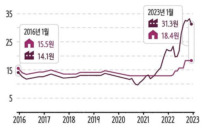그래프를 보면 알겠지만 원래 산업용 천연가스 가격은 주택용보다 저렴했어요. 게다가 흐름도 비슷했죠. 그런데 2020년 후반기부터 산업용의 가스 가격이 요동치기 시작합니다. 그러다가 2021년 3월에 처음으로 역전했고, 7월부터 2023년 1월까지 계속해서 산업용 가스가 주택용보다 가격이 비싼 상황입니다. 반면 주택용 천연가스는 2020년 7월부터 2022년 3월까지 계속 12.9원으로 동결됐죠. 주욱 수평선이 그려진 것 보이죠? 그러다가 22년 4월, 5월, 7월, 10월에 가격이 연거푸 올랐고, 그 영향으로 이번 난방비 쇼크가 발생한 겁니다.