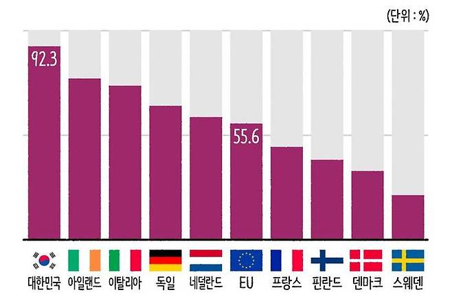 유럽 국가들과 우리나라를 비교해 보면 우리나라의 에너지 수입 의존도가 압도적이라는 걸 바로 알 수 있을 겁니다. 아래 그래프를 봐 볼까요? Eurostat의 2021년 데이터 기준으로 EU 회원 27개국의 에너지 수입 의존도는 55.6%입니다. 반면 2021년 기준 우리나라의 에너지 수입 의존도는 92.3%. 유럽 국가 중 우리나라보다 수입 의존도가 높은 국가는 몰타(97.1%)와 룩셈부르크(92.5%) 정도뿐입니다. 하지만 몰타의 면적은 제주도의 6분의 1 수준이고 룩셈부르크 역시 부산, 울산, 창원을 합친 정도밖에 되질 않는 작은 국가들이기 때문에 이 두 국가로 위안을 삼긴 어렵습니다.