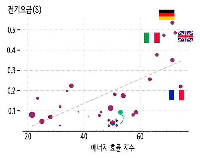 전기를 효율적으로 사용하는 나라들을 살펴보면 대부분 전기요금이 비싼 편입니다. ACEEE 에너지효율 점수와 각 국가들의 전기요금을 가지고 산점도를 뿌려봤습니다. 에너지 효율이 높은 국가들이 대부분 전기 요금이 비싸다는 걸 확인할 수 있죠. 독일, 이탈리아, 영국 같은 유럽 국가들이 대표적이고요. 참고로 그래프에서 원의 크기는 1인당 전기 사용량을 나타냅니다. 에너지 효율도 좋지 않은데 전기요금도 저렴한 편이라 우리나라는 상대적으로 에너지를 많이 쓰고 있다고 할 수 있어요.