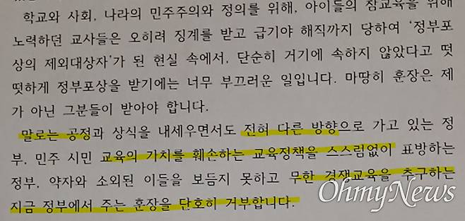| ▲ 한 공립 고교 교사가 올해 2월 훈장을 거부하기 위해 시도교육청에 낸 '훈장 포기서'. |