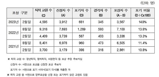 이에 따라 윤석열 정부 들어 정부포상 수상을 포기하거나 거부한 퇴직교원은 모두 1970명으로 전체 1만 3913명의 14.2%로 집계됐다.