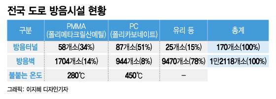 PC 소재 방음터널과 PMMA를 쓴 방음벽은 해당 도로관리청에 시설규모, 인근 주택 유무 등 화재 확산 위험성을 종합 검토해 교체 등 화재 안전 및 방재 대책 마련할 계획이다.