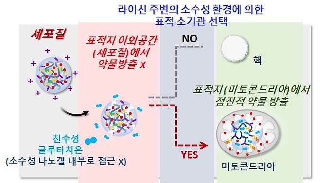 연구팀은 약물이 세포소기관에 전달된 후, 방출되도록 나노약물전달체의 ‘표적 전달’과 ‘표적 방출’이 순차적으로 진행되는 새로운 미토콘드리아 표적 약물 전달 및 방출 설계 전략을 마련했다. 미토콘드리아로의 전달에 영향을 주는 소수성 라이신 기반의 나노겔을 만들어 약물이 세포의 ‘핵 보다 미토콘드리아’로 더 갈 수 있는 ‘표적 전달’을 구현했다. 분해 자극인 글루타치온이 친수성임을 고려해 이황화 결합부위 환경을 소수성화하고 나노겔 내 이황화 결합부위에 글루타치온의 접근을 제한 또는 지연시켜 세포질 글루타치온 보다 미토콘드리아 글루타치온에 의해 이황화 결합이 분해되는 ‘표적 방출’을 성공시켰다.