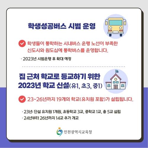 학생들이 통학하는 시내버스 운행 노선이 부족한 신도시와 원도심에는 전국 최초의 원거리 통학버스인 '학생성공버스'를 운영한다. 오는 7월부터 서창, 검단, 영종, 청라, 송도 등 5개 권역에서 시범 운영을 시작한다.