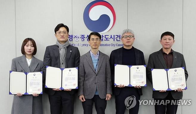 (세종=연합뉴스) 박상옥 행정중심복합도시건설청 시설사업국장이 2일 행복청 회의실에서 올해 현장소장으로 뽑힌 건설업체 관계자와 감리단장으로 선정된 한국토지주택공사(LH)·건축사사무소 관계자에게 상장을 주고 기념사진을 찍고 있다. 왼쪽부터 김다슬 LH 대리, 신현욱 코오롱글로벌 부장, 박상욱 행복청 시설사업국장, 차영철 지에스건설 책임, 심근섭 케이디엔지니어링건축사사무소 전무. 2023.2.2 [행복청 제공. 재판매 및 DB 금지]