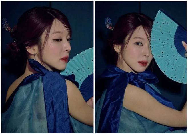 초아는 파란색 한복 스타일의 의상을 입고 사진을 찍었다. 부채를 들고 몽환적인 표정으로 신비로운 매력을 뽐냈다.