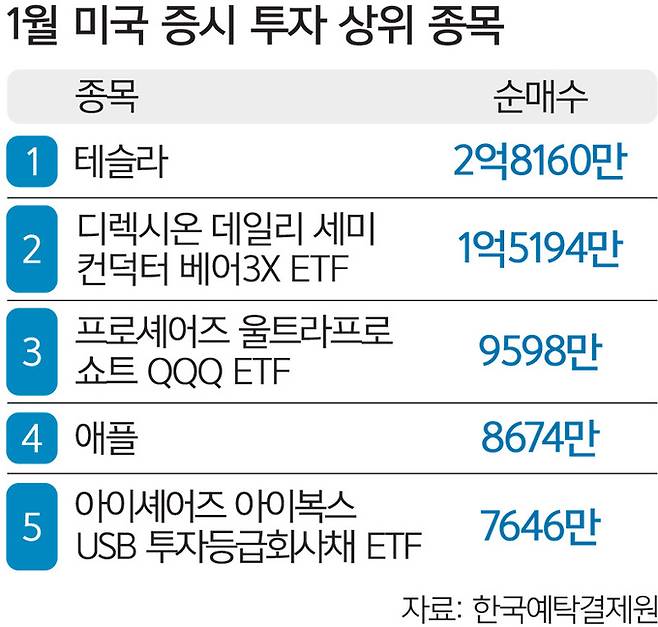 2일 한국예탁결제원에 따르면 지난달 국내 투자자가 미국 증시에서 가장 많이 사들인 종목은 테슬라로 2억8160만달러(약 3434억원)를 순매수했다.