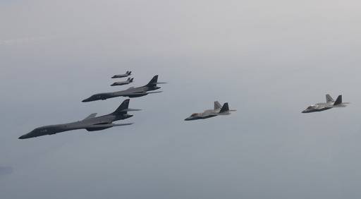 1일 한·미 공군이 서해 상공에서 올해 첫 연합공중훈련을 실시하는 모습. 최근 한·미 국방장관 회담에서 미국이 “한국에 대한 확장억제 공약은 철통같다”며 한반도 수시 전개를 약속한 B-1B 랜서 전략폭격기(일명 ‘죽음의 백조’) 2대를 중심으로 우리 F-35A 전투기 2대(위)와 미측 F-22 랩터 전투기 2대(오른쪽)가 나란히 비행하고 있다. 이에 대해 북한은 2일 외무성 담화를 통해 “우리와의 전면대결에 불을 지피는 것”이라며 강력 반발했다.