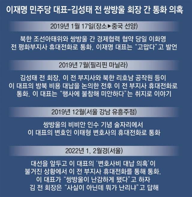 검찰은 이 밖에도 김 전 회장이 2019년 1월 중국 선양에서 북한 측과 만난 후 이 전 부지사의 휴대전화를 통해, 그리고 같은 해 12월 쌍방울의 속옷업체 비비안 인수를 축하하기 위한 술자리에서 이태형 변호사의 휴대전화를 통해 이 대표와 통화한 것으로 파악했다. 이 변호사는 변호사비 대납 의혹의 당사자로 지목된 인물이다. 다만 이 변호사는 “비비안 축하 술자리에 가지도 않았고, 이 대표와 김 전 회장 간 통화를 연결해준 적도 없다”고 해명하고 있다.
