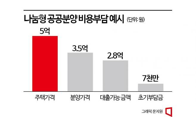 나눔형 공공분양은 지난해 10월 정부가 제시한 3가지 모델 중 하나다. 낮은 분양가로 대출 지원을 받아 공급받고, 추후 매각 시 시세차익을 공공기관과 나누는 것이 골자다.