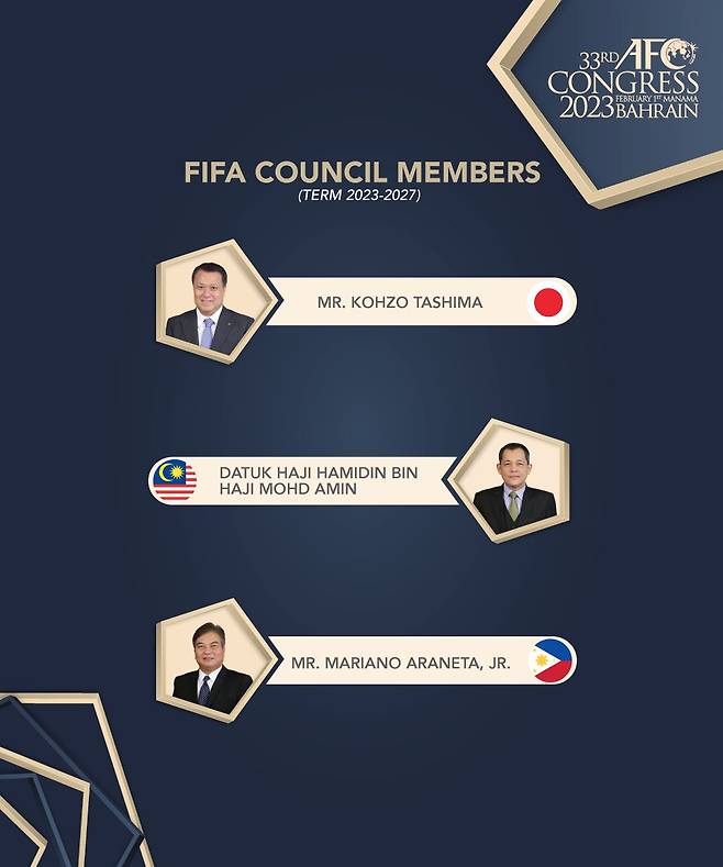 이에 따라 이번 총회에서 AFC 회장 겸 FIFA 부회장으로 단독 출마, 연임에 성공한 바레인 출신 셰이크 살만 빈 이브라힘 알 칼리파 회장까지 합쳐 FIFA 핵심 의사결정기구인 평의회에 아시아를 대표하는 인사들로 중동에서 3명, 동남아에서 3명이 포함됐다.