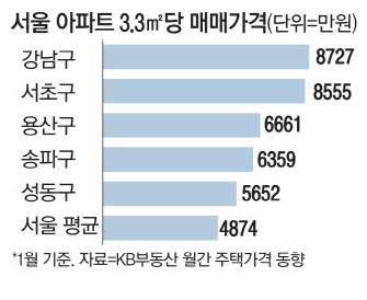 3일 KB부동산 1월 주택가격 동향에 따르면 서울 아파트 가운데 평당 평균 매매가격이 가장 높은 지역은 8727만원을 기록한 강남구로 나타났다. 서초구는 평당 8555만원으로 뒤를 이었다.