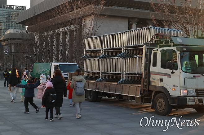 | ▲ 광장 주변을 봉쇄할 철제펜스가 트럭에 실려 대기하고 있다. |