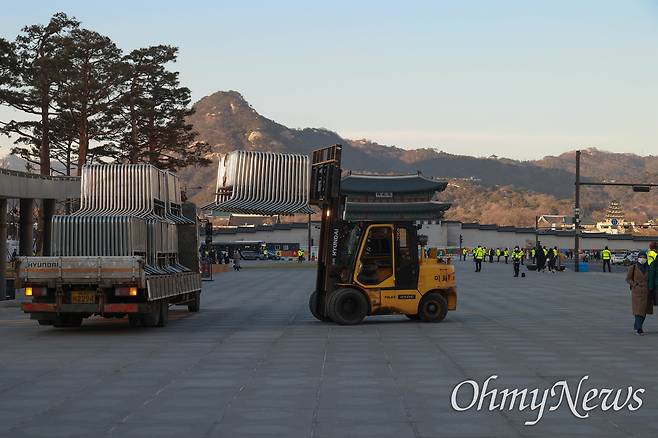 | ▲ 광장 주변을 봉쇄할 철제펜스 설치를 위해 지게차가 작업을 하고 있다. |