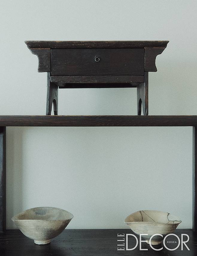 김민호가 무차별적인 수집과 실험 정신을 가진 편이기에, 옆에서 박현아는 그의 기질을 조금씩 통제하고 편집하는 역할을 하며 둘의 마음에 꼭 드는 사물만으로 지금의 공간을 채웠다. “유럽이나 미국 등 해외 디자이너의 아카이브 훑어보기를 좋아해서 그간 쌓아온 취향이 집에 반영되기도 했지만, 조금 더 의식적으로 한국의 사적인 공간을 참고하려고 노력했어요. 서구 것에 대한 오랜 관찰과 동경이 있었지만 아이러니하게도 한국 가구들이 더욱 생경하고 새롭게 느껴졌거든요.” 부부는 최순우, 김환기, 이순우, 유홍준의 집 등을 다시 한 번 깊이 관찰하고 되짚어보며 ‘구관이 명관’이라는 말을 체감했다.