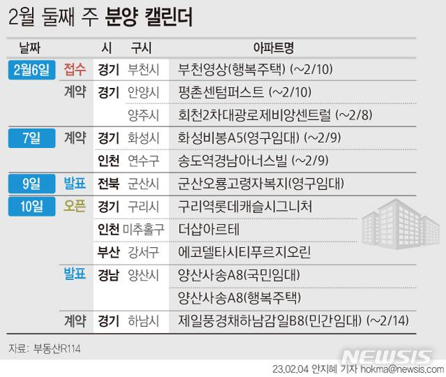 [서울=뉴시스] 홍세희 기자 = 2월 둘째 주에는 경기 부천시 상동 '부천 영상(행복주택)' 1개 단지에서만 청약 접수를 진행한다.