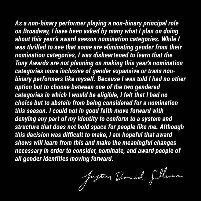 토니상이 배우의 성별을 구분해 상을 주기 때문에 '논 바이너리'인 자신이 설 자리가 없다는 이유에서입니다.