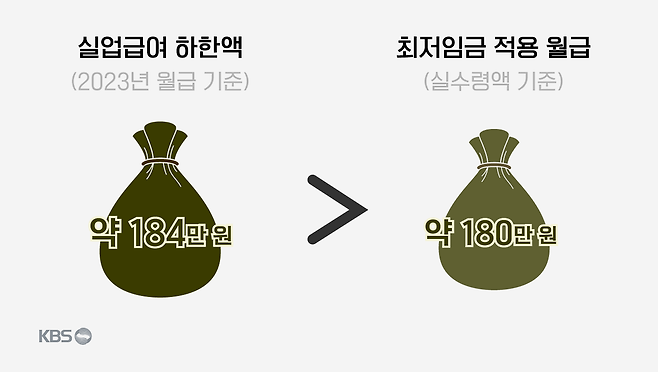 실업급여는 최저임금의 80%로 하한액이 정해지는데, 올해는 한 달에 184만 원 정도를 받게 됩니다. 이를 최저임금을 받는 노동자의 실수령액과 비교해보면 오히려 4만 원 가량 더 많습니다.