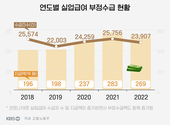 실업급여 부정수급 사례는 지난 5년간(2018~2022) 12만 건이 넘습니다. 금액으로 따지면 1,180억 원이 넘습니다. 매년 2만 건 넘는 부정수급이 적발됐습니다.