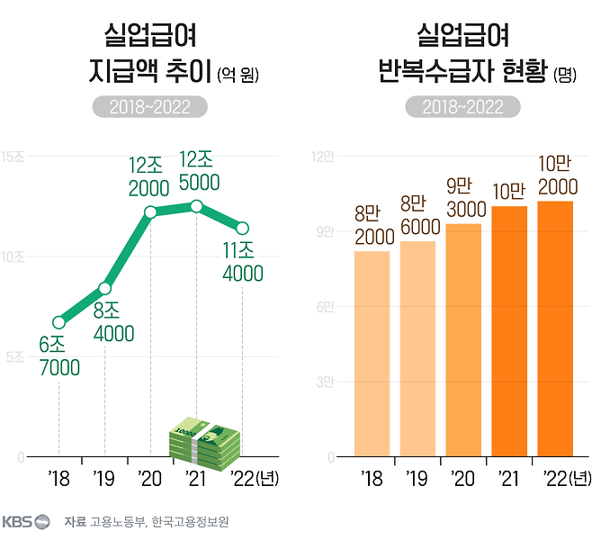 그럼, 실업급여를 여러 번 반복해서 받은 사람들은 얼마나 될까요? 정부는 5년간 3회 이상 받은 사람을 '반복 수급자'로 정의합니다. 정부 데이터에 따르면 지난 5년(2018~2022) 동안 반복 수급자는 꾸준히 늘어났습니다. 2021년부턴 10만 명이 넘었습니다.