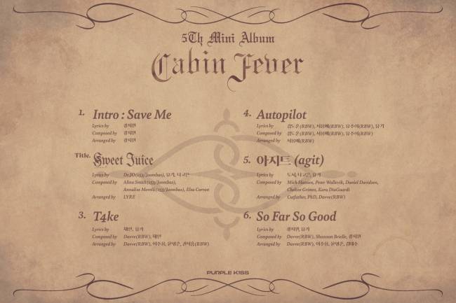 퍼플키스(나고은, 도시, 이레, 유키, 채인, 수안)는 오늘(4일) 0시에 공식 SNS에 다섯 번째 미니앨범 'Cabin Fever'(캐빈 피버)의 트랙리스트 이미지를 올렸다. 퍼플키스의 새 앨범에는 타이틀곡 'Sweet Juice'를 포함해 'Intro : Save Me', 'T4ke', 'Autopilot', '아지트 (agit)', 'So Far So Good'까지 총 6곡이 수록됐다.