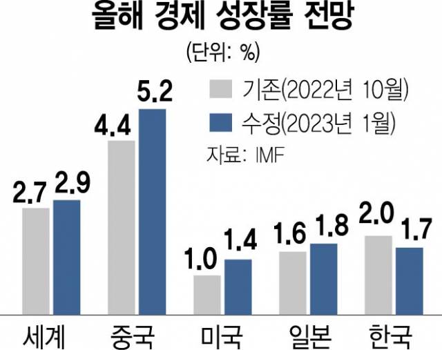 우리 경제가 저성장의 늪에 빠진 일본(1.8%)보다도 못한 성장세를 보일 것이라는 전망도 뼈아픈 지점입니다. 우리 성장률이 일본에 뒤진 것은 1998년 외환위기 이후 처음입니다. IMF는 “인플레이션 대응을 위한 금리 인상과 우크라이나 전쟁이 지속되고 있다”면서도 “중국의 리오프닝(오프라인 활동 재개)에 따른 경기 회복 기대와 미국과 유럽 국가 등 주요국의 예상 외 견조한 소비와 투자를 고려해 성장률을 소폭 상향했다”고 설명했습니다.
