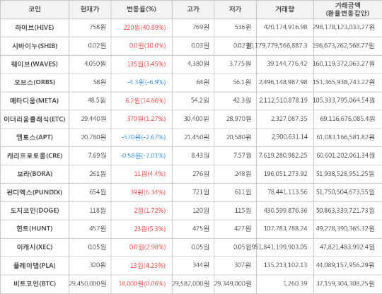 상승세를 보이는 가상화폐는 총 11종목으로 이 중 가장 큰 상승세를 보이는 하이브는 전일 대비 40.89% 상승한 758원에 거래되고 있다.