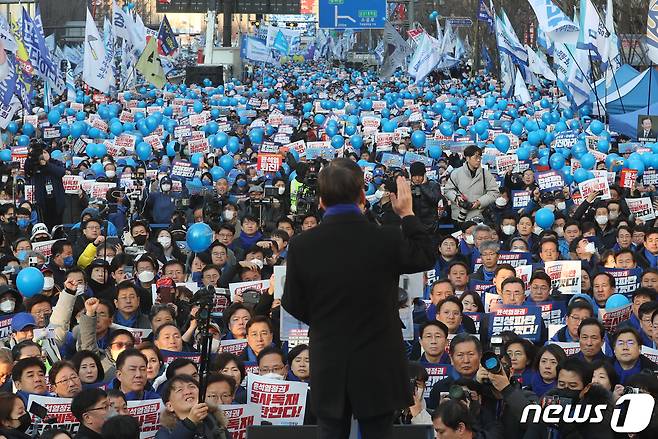 (서울=뉴스1) ,송원영 기자 = 이재명 더불어민주당 대표가 4일 서울 중구 숭례문 앞에서 열린 '윤석열 정권 민생파탄 검사독재 규탄대회'에서 연설을 하고 있다. 2023.2.4/뉴스1