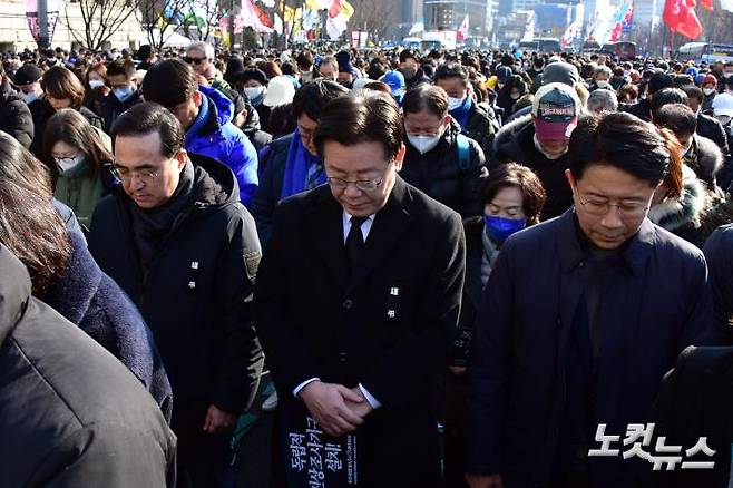10·29 이태원 참사 유가족협의회와 시민대책회의가 4일 참사 100일 거리 행진' 도중 서울광장에 추모 분향소를 설치하고 시민추모대회를 가진 가운데 더불어민주당 이재명 대표가 참석해 묵념을 하고 있다.