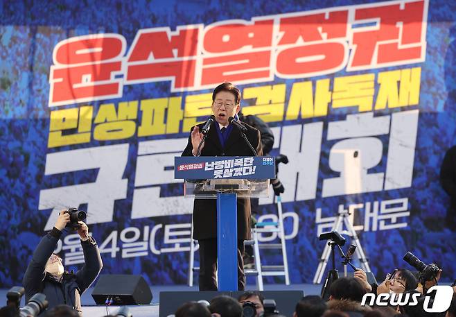 (서울=뉴스1) ,송원영 기자 = 이재명 더불어민주당 대표가 4일 서울 중구 숭례문 앞에서 열린 '윤석열 정권 민생파탄 검사독재 규탄대회'에서 연설을 하고 있다. (공동취재) 2023.2.4/뉴스1