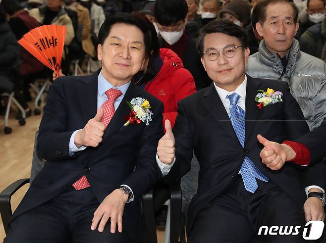 (고양=뉴스1) ,송원영 기자 = 국민의힘 당권 주자인 김기현 의원과 윤상현 의원이 4일 경기 일산서구청에서 열린 고양정 당협의회 신년하례식에서 엄지척을 하고 있다. 2023.2.4/뉴스1