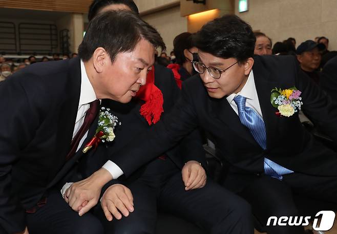 (고양=뉴스1) ,송원영 기자 = 국민의힘 당권 주자인 안철수·윤상현 의원이 4일 경기 일산서구청에서 열린 고양정 당협의회 신년하례식에서 대화를 하고 있다. 2023.2.4/뉴스1