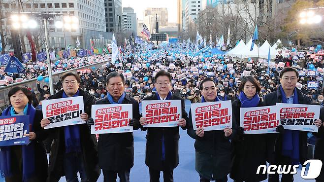 (서울=뉴스1) ,송원영 기자 = 이재명 더불어민주당 대표가 4일 서울 중구 숭례문 앞에서 열린 '윤석열 정권 민생파탄 검사독재 규탄대회'에서 손피켓을 들고 있다. (공동취재) 2023.2.4/뉴스1