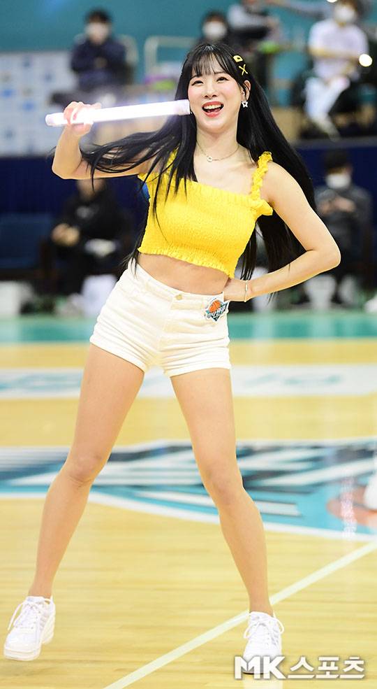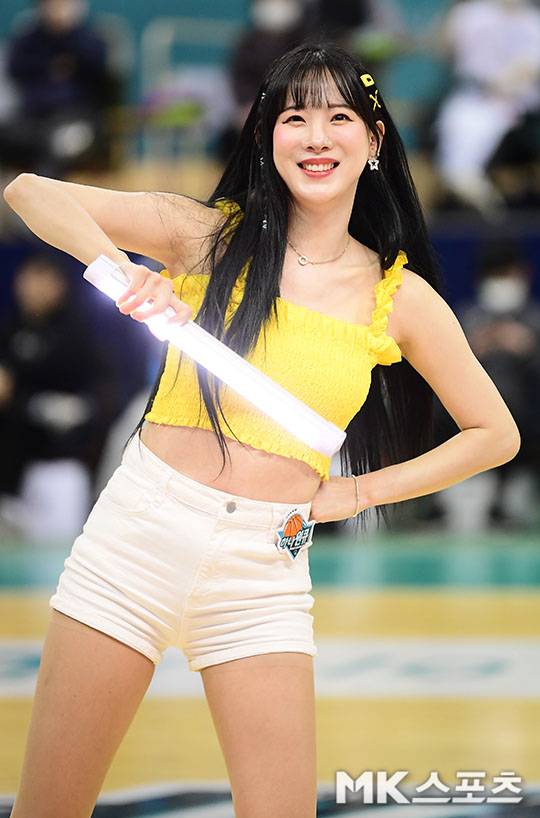 하나원큐 치어리더 김한나는 4일 오후 경기도 부천체육관에서 열린 ‘2022-2023 여자 프로농구’ 삼성생명 경기와의 경기에서 화사한 의상과 함께 농구팬들 살살 녹이는 애교 안무를 펼쳤다.