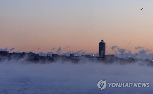 epa10446994 Sea smoke, forms over the water of Boston Harbor, with Boston's Logan International Airport as a backdrop, in Boston, Massachusetts, USA, 04 February 2023. Sea smoke, or steam fog, forms when cold air flows immediately over warmer water. A cold airmass moved into the region setting a new record low temperature for Boston of -9 F (-22.7C), along with wind gusts of 35 mph to 50 mph (56.33kph to 80.47kph) driving windchill temperatures to as low as -40F (-40C). EPA/CJ GUNTHER