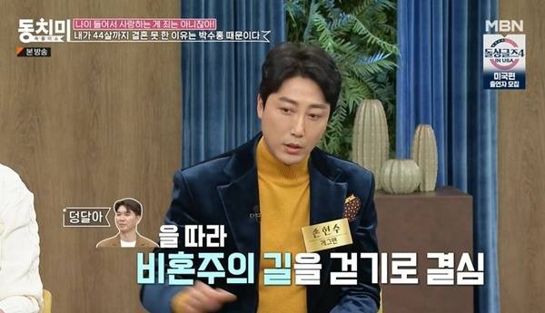 이어 손헌수는 "볼 때마다 30대 후반까지만 해도 '헌수야 너 결혼할 거니? 난 결혼 안 하려고. 동치미 출연자들 이야기 들으면 나는 결혼 못할 거 같다' 결혼은 안 좋은 건가? 생각이 드는 거다. 선배님도 비혼주의하니까 나도 비혼해 보자 가고 있는데 어느 날 갑자기 사랑하는 분 만나고 결혼하더니 '헌수야 결혼해라. 결혼 너무 좋다. 내 편이 생기는 거야. 꼭 해라'"라고 박수홍의 돌변을 폭로했다.