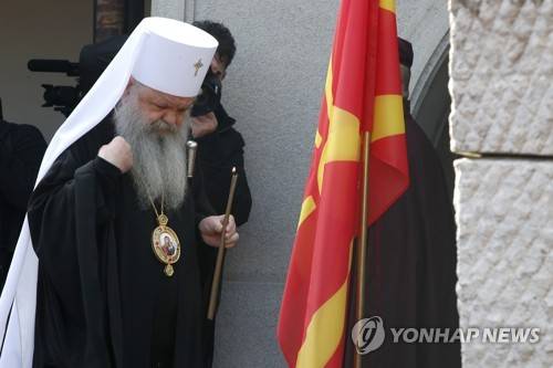 Macedonian Orthodox Archbishop Stefan lights a candle at the grave of Goce Delcev, a revolutionary who opposed Ottoman rule in the Balkans that ended after hundreds of years in the early 20th century, at the church of the Ascension of Jesus, in Skopje, North Macedonia, on Saturday, Feb. 4, 2023. North Macedonia is honoring Saturday the birth of 19th century revolutionary hero Goce Delcev with tight security in capital Skopje amid fears of potential clashes between opposing nationalist groups from North Macedonia and Bulgaria, as both neighboring countries have claims of the historic figure. (AP Photo/Boris Grdanoski)