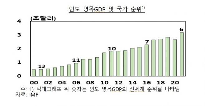 한국은행은 5일 해외경제포커스에 실린 '인도경제 현황과 성장잠재력 및 리스크 평가' 보고서에서 "서방국가와 중·러 갈등으로 글로벌 공급망에서 중국의 역할이 축소됨에 따른 반사 효과로 인도가 대두되고 있다"며 이같이 밝혔다.