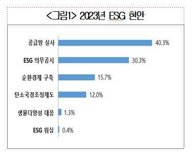 국내 기업 300곳을 대상으로 ESG 현안을 묻자 응답 기업의 40.3%가 공급망 ESG 실사 대응이라고 답했다. 이어 ESG 의무공시(30.3%), 순환경제 구축(15.7%), 탄소국경조정제도(12.0%) 순이었다.