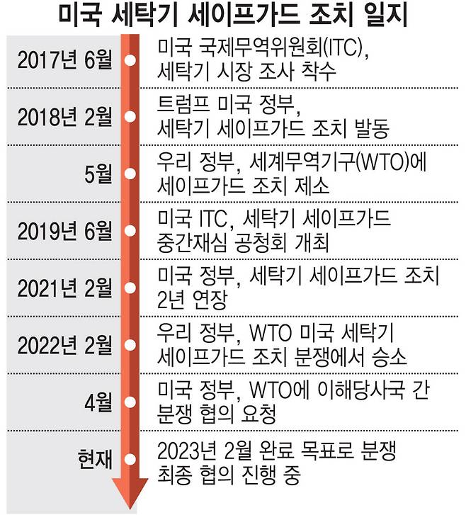 미국 정부는 아직 방침을 정하지 않았지만 연장하기엔 부담스러운 상황이다. 지난해 2월 세계무역기구(WTO)가 미국 세이프가드 관련 핵심 쟁점 5개 모두 위법하다며 한국의 손을 들어준 게 컸다. 당시 도널드 트럼프 정부가 강력하게 추진한 미국 자국 우선주의에 국제기구가 경고음을 보내면서 세탁기 세이프가드 조치가 동력을 잃은 것으로 분석된다.