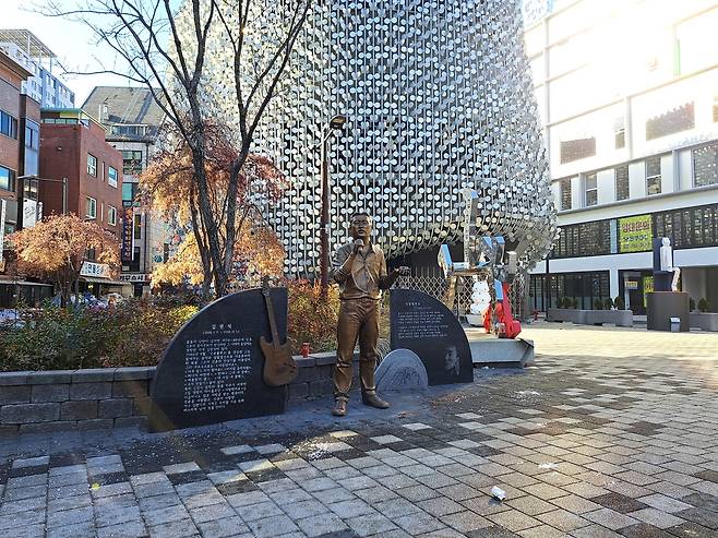 | ▲ 창천문화공원 모 백화점 뒤 조그마한 공원. 신촌에서 활동하다 고인이 된 가수 김현식이 노래하는 모습의 작은 동상이 서 있다. |