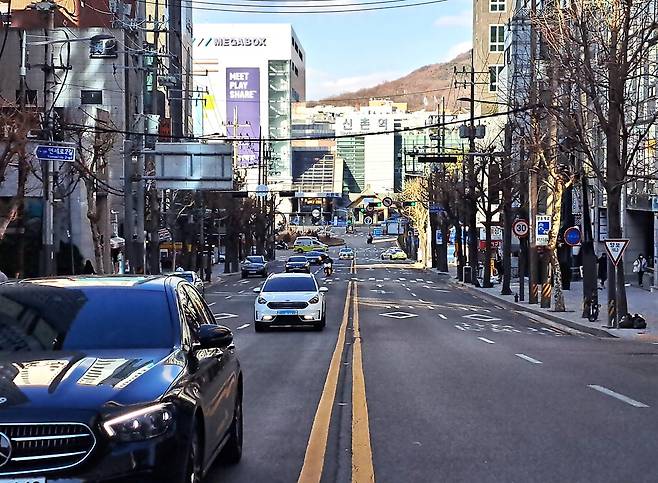 | ▲ 연세로 로터리에서 연세대 방향 도로. 오랫동안 한자리를 지키고 있는, 사진 오른 편 홍익문고가 오히려 반갑다. |