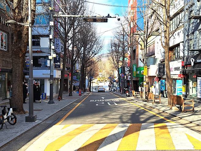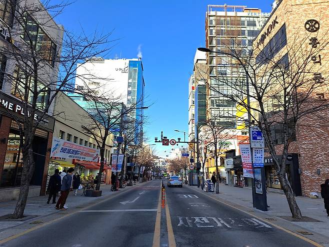 | ▲ 이대 앞 1930년대 기준으로 형성된 이대 앞 도로는 폭이 좁다. 1980년대 하늘 높은 줄 모르던 상권이 쇠락해 지금은 한산하다. |