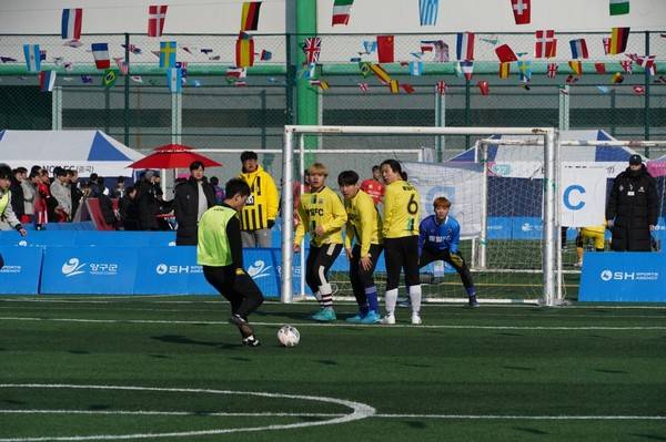 [풋볼리스트] '2023 양구 피스컵 탈북민&다문화 축구 페스티벌'이 2월 4일과 5일, 강원도 양구군 양구종합운동장에서 성황리에 개최됐다. 탈북민&다문화 가정 등 신(新)구성원의 사회적응 지원 및 글로벌 사회공헌의 취지로 개최된 이번 대회는 SH스포츠에이전시(대표 문성환) 가 주최, 주관했으며, 양구군(군수 흥원), (재)양구군스포츠재단, 포천인삼영농조합, 하하마스크, KBS스포츠예술과학원, HIGHSOL, 풋볼리스트, 선메디컬센터, 아르코발레노원주점, AIRDOME_SH, 곱창상회, 몽고왕주가 후원했다. 통일FC의 경기 장면.