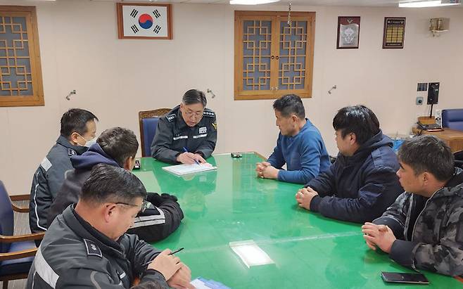 [서울=뉴시스] 조수정 기자 = 김종욱 해양경찰청장이 5일 전남 신안군 통발어선 청보호 전복사고와 관련해 현장지휘함인 3015함에서 잠수요원, 민간잠수사 등과 최적의 수색 및 구조를 위한 상황회의를 진행하고 있다. (사진=해양경찰청 제공) 2023.02.05. photo@newsis.com *재판매 및 DB 금지