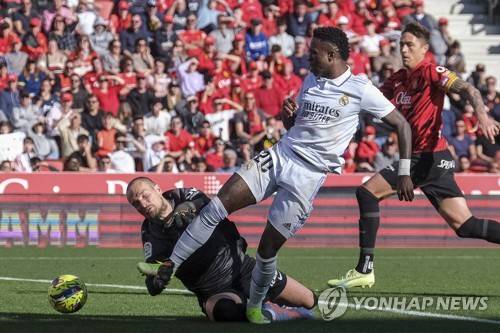 epa10448902 Mallorca's goalie Predrag Rajkovic (L) vies for the ball with Real Madrid's Vinicius Jr (R) during the Spanish LaLiga soccer match between RCD Mallorca and Real Madrid, in Mallorca, Spain, 05 February 2023. EPA/CATI CLADERA
