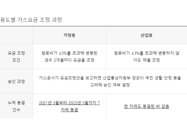 과거 한국 가스요금 체계는 산업용과 가정용 비용을 거의 비슷하게 매기는 식이었다. 하지만 2020년 8월 정부가 산업용·가정용 도시가스 요금 변동방식을 이원화하면서 사정이 달라졌다. 가정용 요금은 정부 통제로 매번 동결됐지만, 산업용 요금은 국제유가에 따라 등락을 반복했다.