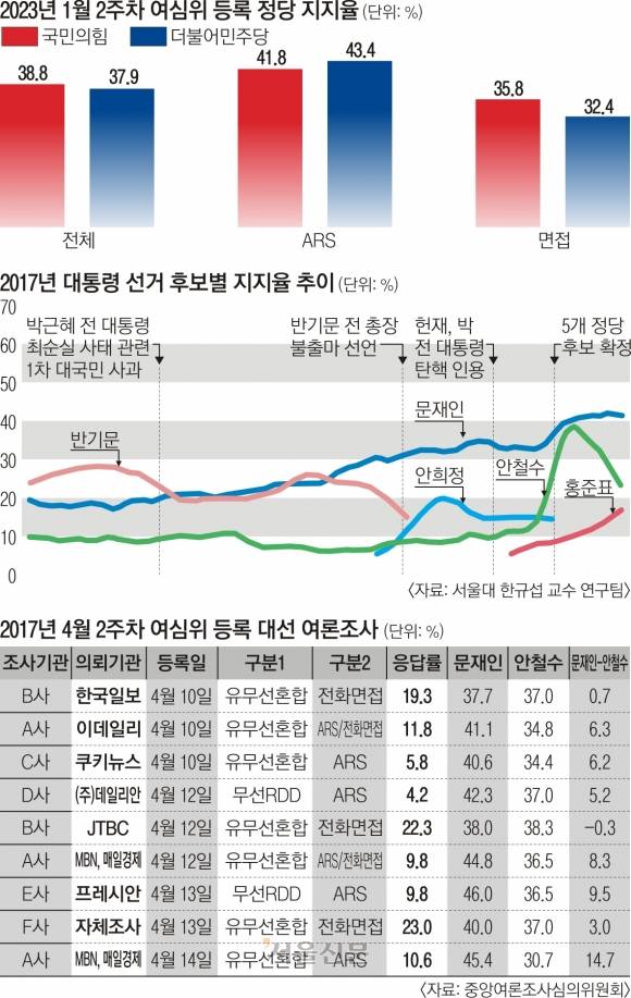 지금은 상황이 다르다. 2017년 당시 면접조사에서는 문 전 대통령 지지율이 ARS(자동응답)조사보다 약 10% 포인트나 더 높았다. 면접원에게 자신의 정치적 성향을 밝히는 것을 극도로 꺼린 보수 유권자들 다수가 아예 여론조사를 거부했던 것으로 해석할 수 있다. 반면 지난 1월 2주차 윤 대통령 지지율은 ARS에서 39.9%, 면접조사에서 38.7%로 추정돼 차이가 크지 않다. 문 정부 때도 ARS와 면접조사 간 괴리가 ‘샤이 보수’ 현상으로 나타난 비정상적인 문 전 대통령 지지율 고공행진이 멈추면서 사라졌다. 한마디로 윤 대통령 지지율이 전 정부와 큰 차이가 없어 여론조사 전반에 대한 편향성 문제를 제기하는 것은 타당치 않아 보인다.